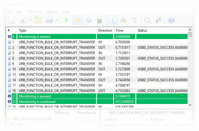 Every event has its own unique number, type, direction (out from the Host Controller Driver or into the Host Controller Driver), timestamp and status of processing packet by the Host Controller Driver.